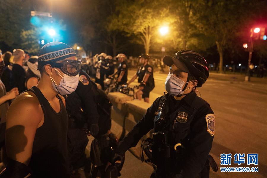 6月22日,警察和示威者在美國(guó)華盛頓白宮附近對(duì)峙。美國(guó)警察和示威者22日晚在首都華盛頓市白宮北側(cè)拉斐特廣場(chǎng)發(fā)生沖突并對(duì)峙。美國(guó)總統(tǒng)特朗普在社交媒體上說(shuō),許多人因破壞廣場(chǎng)上美國(guó)前總統(tǒng)安德魯·杰克遜的雕像及附近圣約翰圣公會(huì)教堂被逮捕。新華社記者劉杰攝