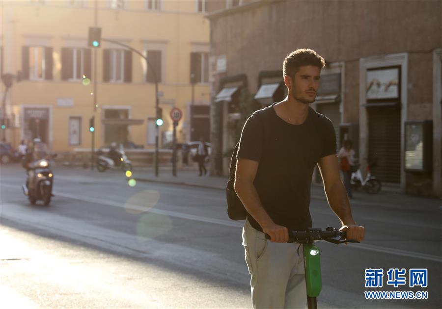 6月23日,在意大利首都羅馬,一名男子騎著電動踏板車在城市中穿行。新華社記者程婷婷攝