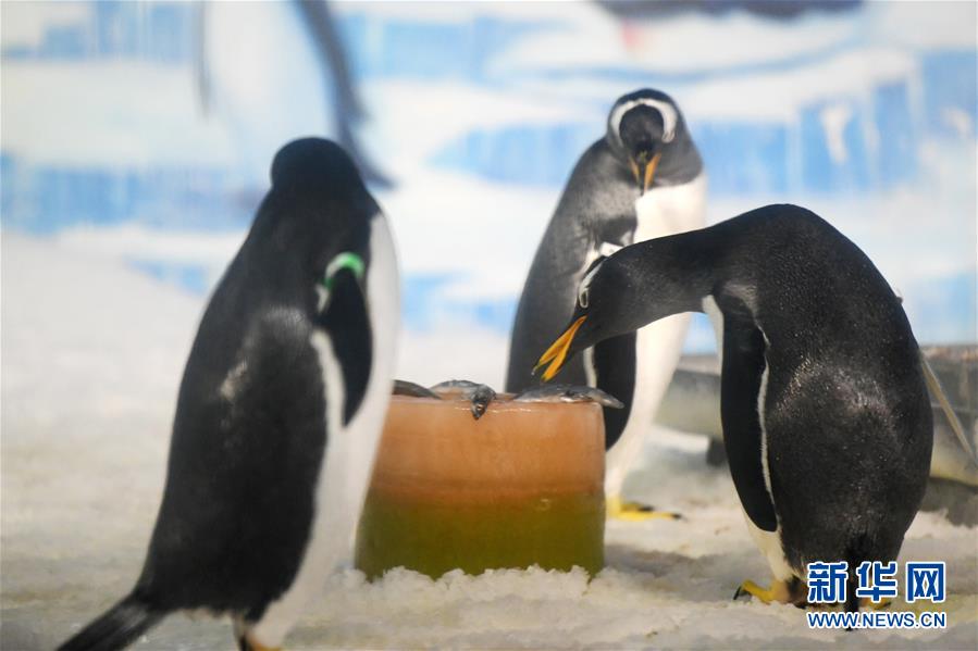 6月24日,哈爾濱極地館的企鵝在享用工作人員送來(lái)的美食。當(dāng)日,哈爾濱極地館的工作人員特地準(zhǔn)備了“魚(yú)粽”“肉粽”,讓生活在這里的極地動(dòng)物也品嘗一下端午美食。新華社記者王建威攝