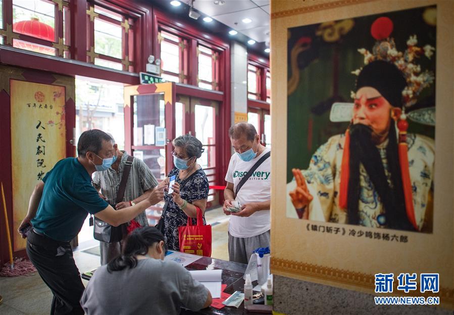 6月26日,市民掃健康碼登記后進入武漢市人民劇院。當日,武漢市中心7家劇場恢復開放,各大文藝院團恢復線下演出,市民再次坐在劇場內(nèi)觀看“戲碼頭”上群星云集、百戲薈萃。新華社記者 肖藝九 攝