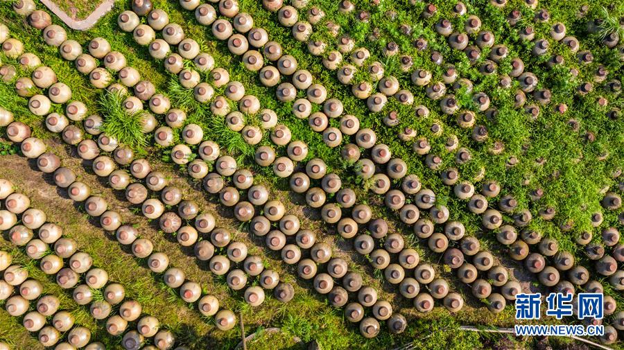 赤水曾氏曬醋廠晾曬的醋壇(6月26日攝,無人機(jī)照片)?!俺嗨畷翊住辈捎霉腆w發(fā)酵繁殖產(chǎn)生天然醋酸菌,醋醅和成品醋都在日光下曝曬而成,故稱曬醋。“赤水曬醋”制作歷史悠久,工序考究,2009年被列入貴州省級非遺名錄。新華社記者 陶亮 攝