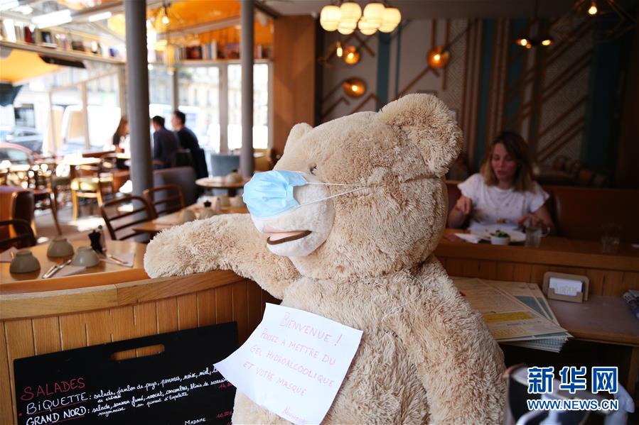 6月18日,在法國(guó)巴黎一家餐館內(nèi),一只毛絨玩具熊被戴上口罩,胸前掛著“歡迎光臨,請(qǐng)使用消毒洗手液并佩戴口罩”的牌子。新華社記者高靜攝