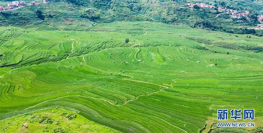 貴州省盤州市新民鎮(zhèn)的梯田風(fēng)光(6月29日攝,無人機(jī)照片)。夏日時節(jié),貴州省盤州市新民鎮(zhèn)的梯田風(fēng)景如畫。新華社記者陶亮攝