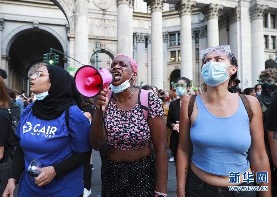 6月30日,人們在美國紐約市政廳附近參加抗議活動。由美國明尼蘇達(dá)州明尼阿波利斯市非裔男子弗洛伊德遭白人警察暴力執(zhí)法而死一事引發(fā)的各種抗議活動仍在紐約持續(xù)進(jìn)行。新華社記者王迎攝