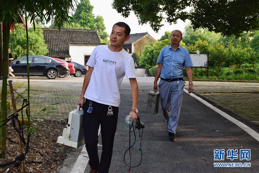 6月30日,朱生榮(右)和兒子朱強(左)攜帶放映設備來到馬鳴村將軍湖廣場。新華社記者鄭夢雨攝