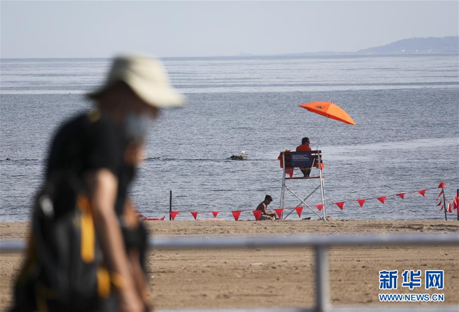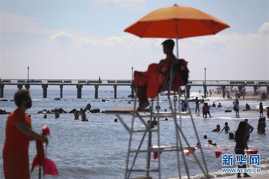 7月1日,人們?cè)诿绹~約科尼島戲水。當(dāng)日,美國紐約市屬八處海灘正式重新準(zhǔn)許民眾游泳,救生員也同時(shí)上崗。新華社記者王迎攝