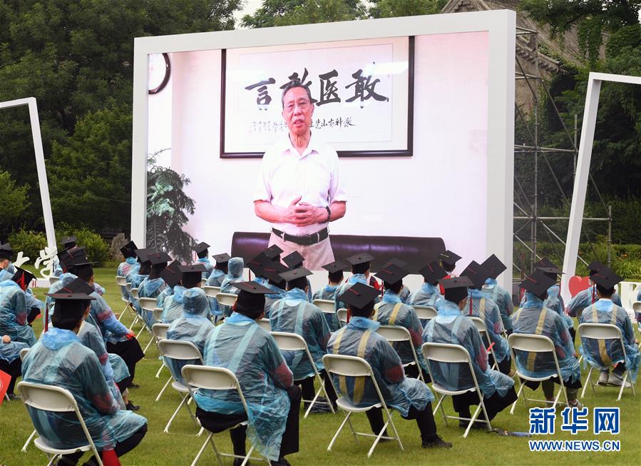 7月2日,2020屆畢業(yè)生在畢業(yè)典禮上觀看校友代表、國家呼吸系統(tǒng)疾病臨床醫(yī)學研究中心主任鐘南山發(fā)言視頻。當日,北京大學舉行2020年畢業(yè)典禮。由于疫情防控需要,今年的典禮在北京大學辦公樓西側(cè)廣場、靜園草坪、未名湖等九個會場舉行,并面向全球進行中英文雙語直播,僅部分在校畢業(yè)生現(xiàn)場參加,更多畢業(yè)生通過線上直播參與畢業(yè)典禮。新華社記者任超攝