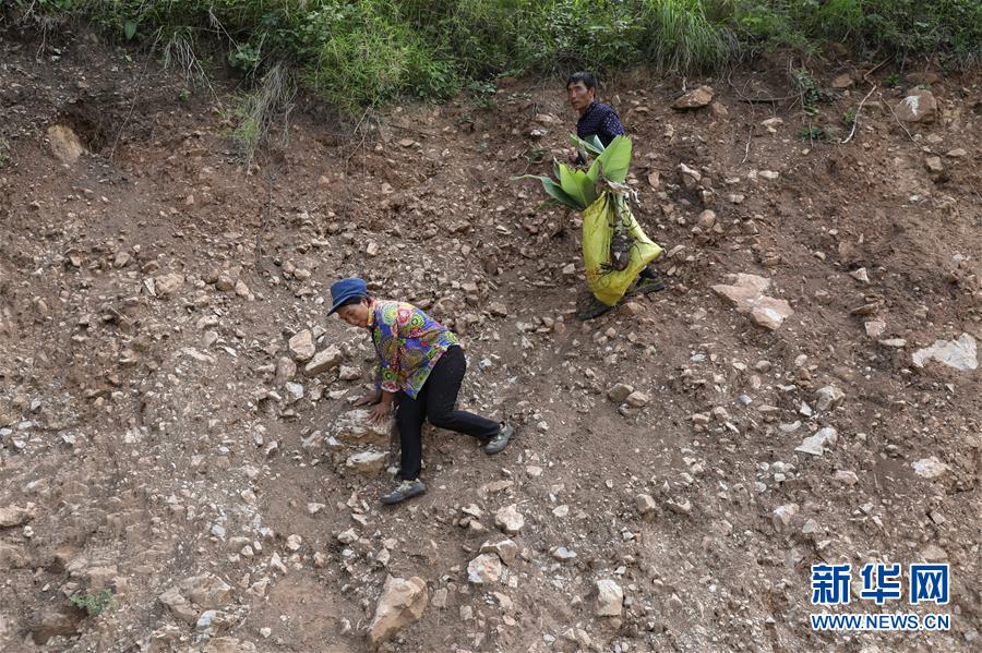 且沙次干、阿達么日雜夫婦在懸崖峭壁上挖了幾株野生的地涌金蓮花,準備栽種在新居門前(6月27日攝)。新華社記者 江宏景 攝