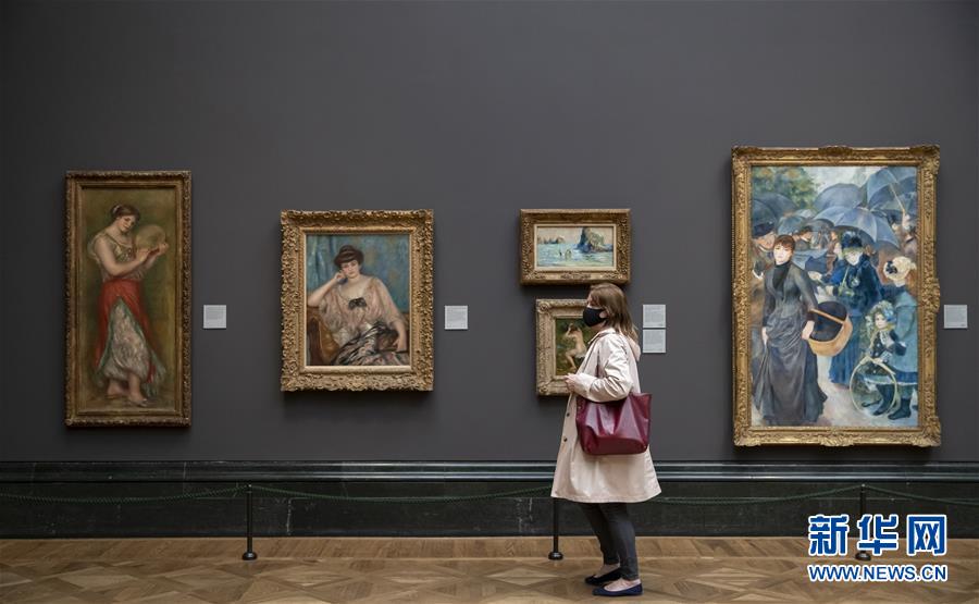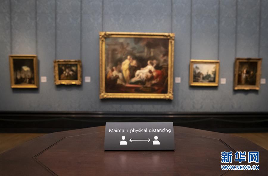 7月4日,參觀者佩戴口罩在英國國家美術館的媒體開放日上參觀。受新冠疫情影響而關閉的英國國家美術館將于7月8日重新對公眾開放,成為倫敦首批開門迎客的博物館、美術館。參觀者需提前網(wǎng)上預約參觀時段,全程佩戴口罩且保持安全距離。新華社記者韓巖攝