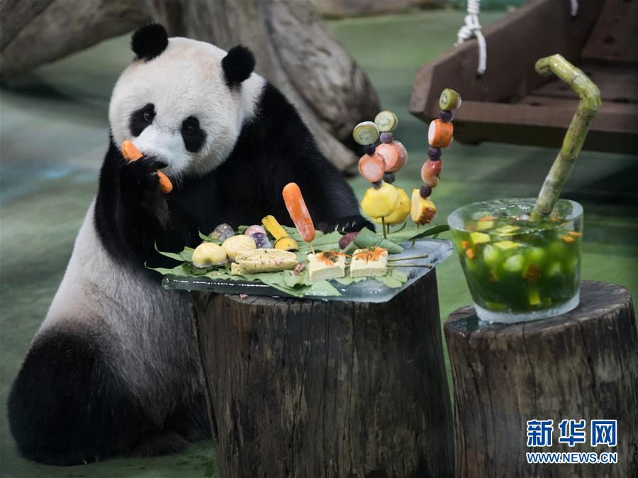 7月6日,在臺(tái)北市立動(dòng)物園,大熊貓“圓仔”正在品嘗特制的生日蛋糕。新華社記者金立旺攝