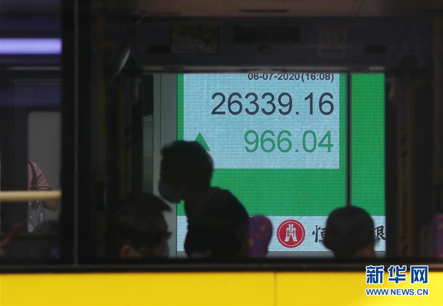 7月6日,人們從位于香港中環(huán)的股市信息屏前經(jīng)過。香港恒生指數(shù)6日漲966.04點,漲幅3.81%,收報26339.16點。全日主板成交2507.97億港元。新華社記者李鋼攝