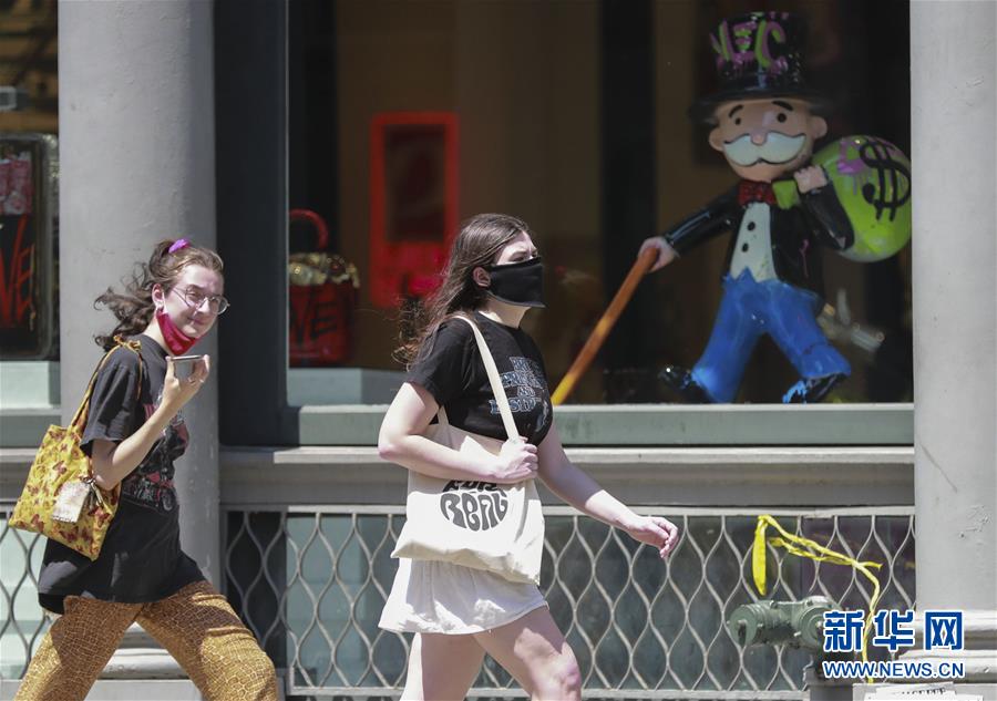 7月6日,佩戴口罩的行人走過美國紐約的一家糖果店。新華社記者王迎攝