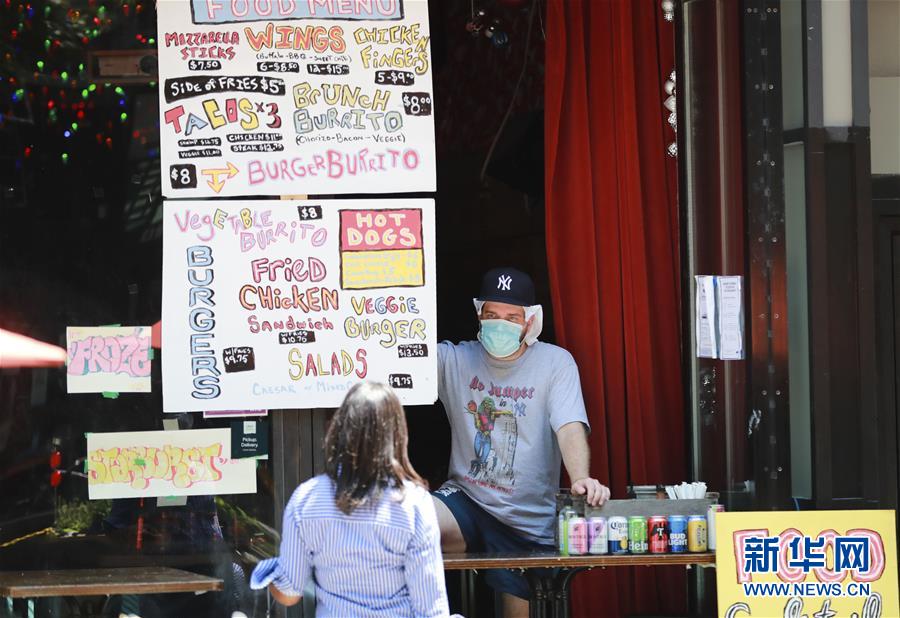 7月6日,美國紐約一家餐廳的服務(wù)人員與顧客交談。新華社記者王迎攝