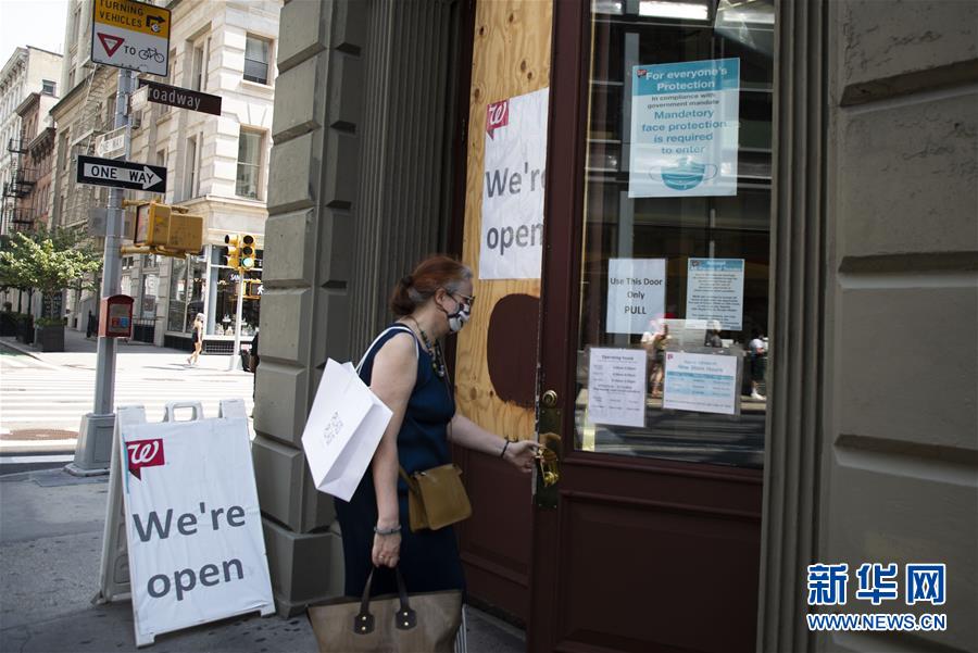 7月6日,佩戴口罩的顧客進入美國紐約的一家超市。新華社記者王迎攝