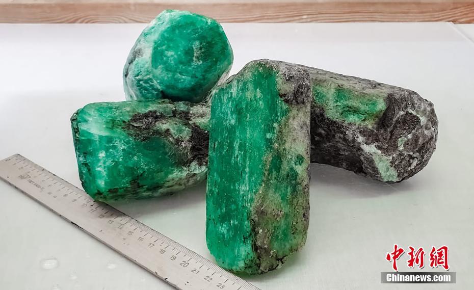 當(dāng)?shù)貢r(shí)間7月7日,俄羅斯斯維爾德洛夫斯克州,俄羅斯國家技術(shù)集團(tuán)在馬林斯克礦區(qū)內(nèi)發(fā)現(xiàn)總重量達(dá)4.8公斤的4塊綠寶石,是最近20年來發(fā)現(xiàn)的同類品質(zhì)中最大的寶石。圖片來源:視覺中國