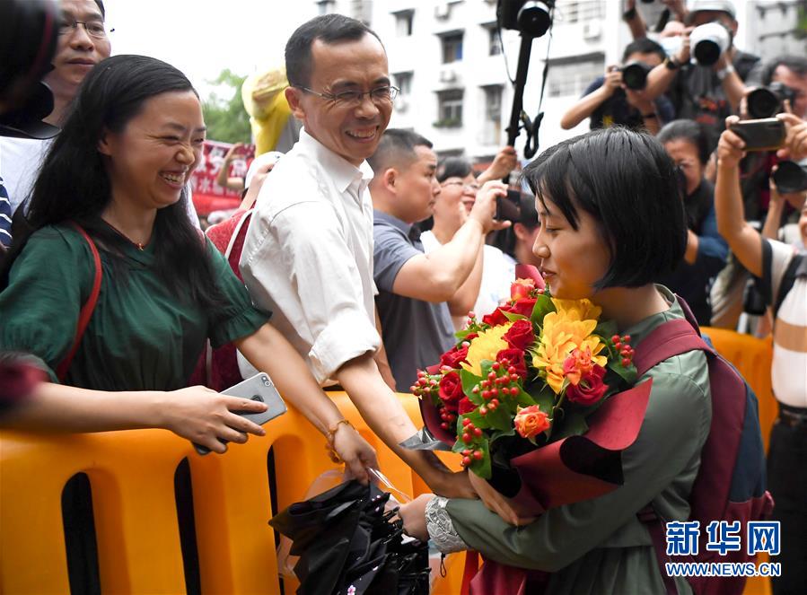 7月8日,一名考生(右)在湖南省長沙市一中考點外從家長手中接過鮮花。當日,全國部分地區(qū)2020年高考結束。新華社記者薛宇舸攝