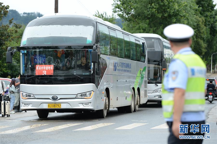 7月9日,接送考生的大巴車抵達歙縣第二中學(xué)考點。受強降雨影響,2020年高考安徽歙縣考區(qū)7月7日未能如期開考,經(jīng)研究并報教育部批準,歙縣考區(qū)于9日啟用2020年普通高等學(xué)校招生全國統(tǒng)一考試語文、數(shù)學(xué)(文、理)科目副題進行考試。新華社記者黃博涵攝