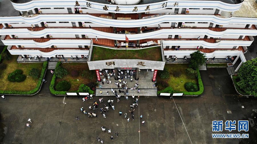 7月9日,考生進入歙縣第二中學(xué)考點(無人機照片)。受強降雨影響,2020年高考安徽歙縣考區(qū)7月7日未能如期開考,經(jīng)研究并報教育部批準,歙縣考區(qū)于9日啟用2020年普通高等學(xué)校招生全國統(tǒng)一考試語文、數(shù)學(xué)(文、理)科目副題進行考試。新華社記者黃博涵攝