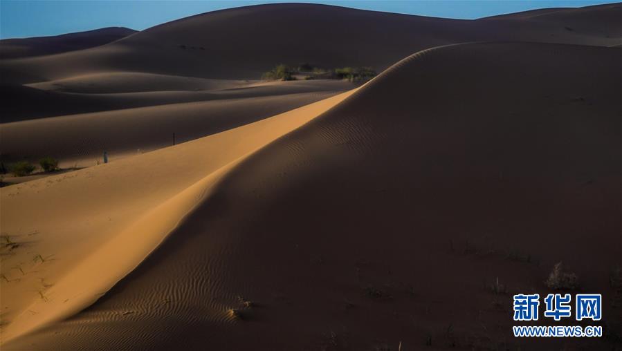 這是7月8日拍攝的騰格里沙漠風(fēng)光。位于內(nèi)蒙古自治區(qū)阿拉善左旗西南部和甘肅省中部邊境的騰格里沙漠是我國第四大沙漠,總面積約為4.3萬平方公里。夏日傍晚,騰格里沙漠連綿的沙丘被日光勾勒出美麗的線條,美不勝收。新華社記者連振攝