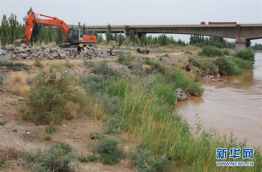 7月11日,工人在黃河內(nèi)蒙古磴口段南套子險(xiǎn)工段進(jìn)行除險(xiǎn)加固。新華社記者李云平攝