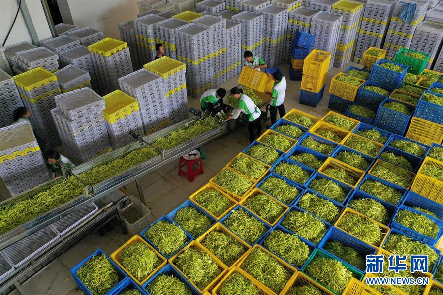 7月12日,祁東縣黃土鋪鎮(zhèn)雁隆食品公司內(nèi),工人通過傳送帶運(yùn)送黃花菜準(zhǔn)備加工(無人機(jī)照片)。新華社記者 趙眾志 攝