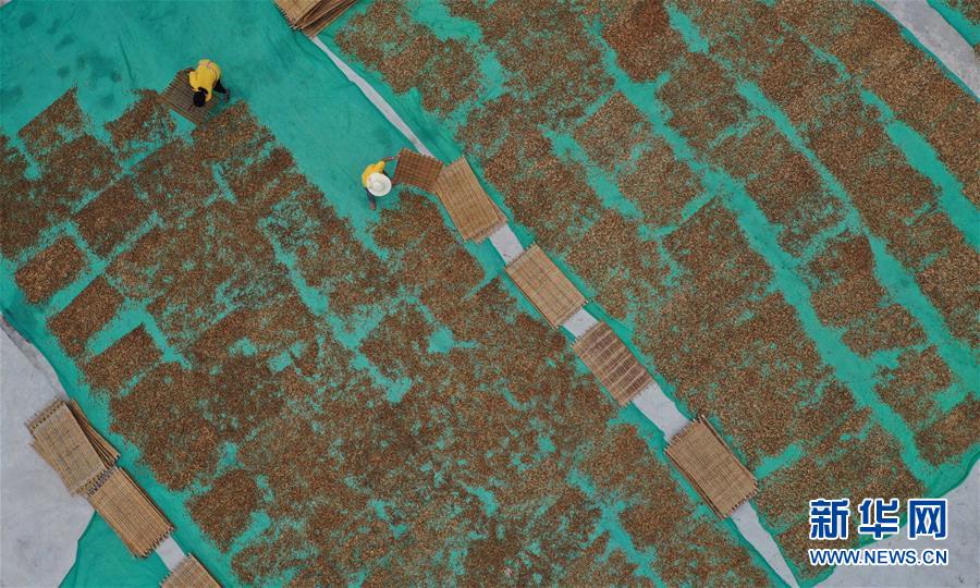 7月12日,祁東縣黃土鋪鎮(zhèn)雁隆食品公司內(nèi),工人在晾曬黃花菜(無人機(jī)照片)。新華社記者 趙眾志 攝