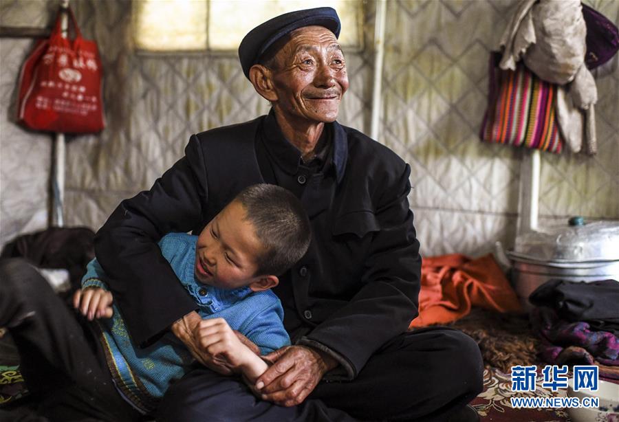 在新疆伊犁特克斯縣境內(nèi)的夏牧場里,一位老人在帳篷內(nèi)和孫子一起玩耍(7月1日攝)。新華社記者 王菲 攝