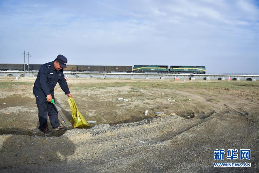 在可可西里索南達(dá)杰保護(hù)站附近青藏鐵路沿線,龍周才加在撿拾垃圾(6月30日攝)。新華社記者 張龍 攝