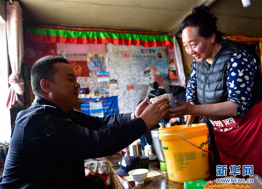 在可可西里不凍泉保護(hù)站周邊牧民家休息時,當(dāng)?shù)啬撩窠o龍周才加準(zhǔn)備酸奶(6月29日攝)。新華社記者 張龍 攝