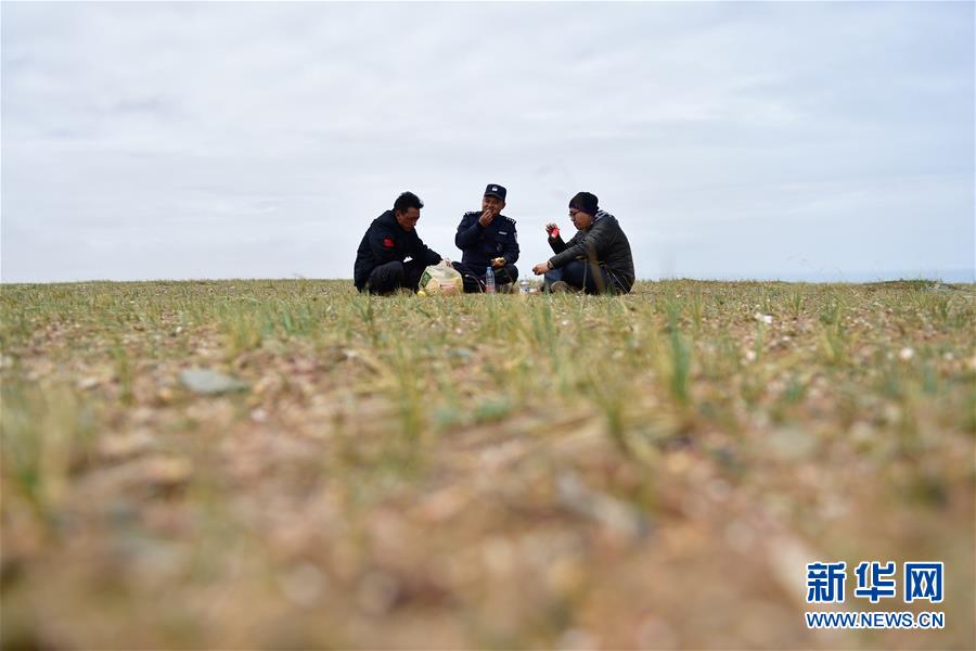 在可可西里索南達杰保護站,龍周才加(中)與隊友才仁多杰(左)、王文豪在管護區(qū)域巡查時吃午飯(6月30日攝)。新華社記者 張龍 攝