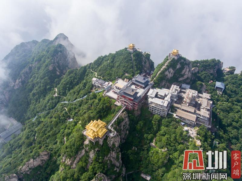 在海拔2217米的山頂上,矗立著3座明清皇家宮殿建筑風格的建筑,山峰高聳、山谷深不見底,這些建筑群宛如“漂浮”在云端,巧奪天工,似人間仙境。