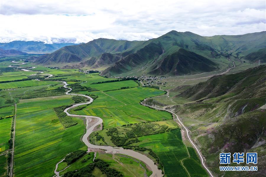 拉薩市林周縣江熱夏鄉(xiāng)田園景色(7月14日攝,無人機照片)。林周縣地處西藏中部,拉薩河上游。夏日時節(jié),這里水草豐茂,綠意盎然,河流、村落、農(nóng)田組成一幅美麗的田園畫卷。新華社記者 詹彥 攝