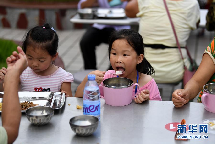 7月14日,小朋友在宿松縣洲頭鄉(xiāng)中心小學(xué)集中安置點(diǎn)吃晚餐。近日,安徽省宿松縣洲頭鄉(xiāng)泗洲村的300多名村民因洪水被轉(zhuǎn)移到該鄉(xiāng)中心小學(xué)集中安置點(diǎn)。安置點(diǎn)工作人員、志愿者利用學(xué)校食堂為村民們烹飪飯菜,讓村民們?cè)诎仓命c(diǎn)吃上熱騰騰的三餐。新華社記者 劉軍喜 攝