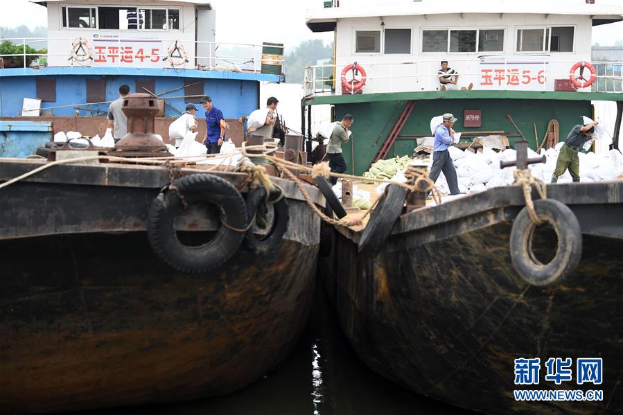 7月14日,當?shù)卮迕裢簧习徇\砂石袋。近日,受洪水影響,安徽省望江縣華陽鎮(zhèn)境內(nèi)的江調(diào)圩內(nèi)部道路漫水,搶險車輛無法進入。當?shù)胤姥床块T組織船只裝載砂石袋等防汛物資,運往圩堤保防汛。新華社記者 劉軍喜 攝