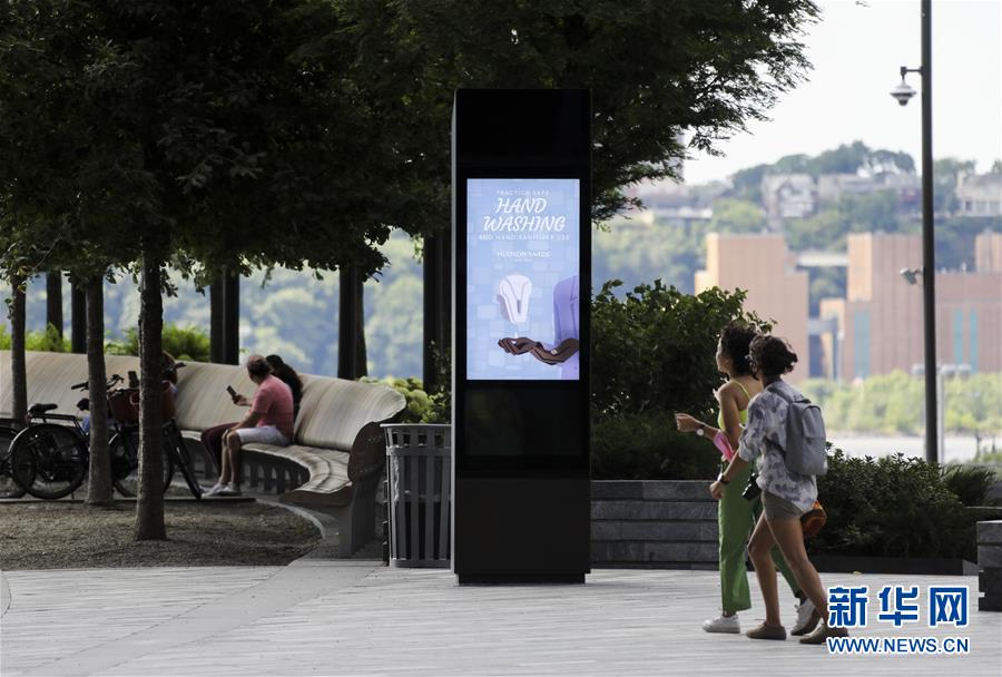 7月14日,在美國紐約一家尚未恢復店內(nèi)購物的購物中心外,電子屏介紹正確洗手的方式。美國約翰斯·霍普金斯大學:截至北京時間15日6時34分,全球新冠確診病例達13258016例,死亡病例為576752例。美國是全球疫情最嚴重的國家,確診病例達3416222例,死亡病例為136319例。新華社記者 王迎 攝