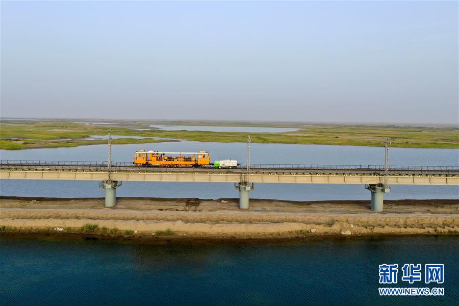 鋼軌打磨車在臺特瑪湖特大橋上作業(yè)(7月14日攝,無人機(jī)照片)。新華社記者 丁磊 攝