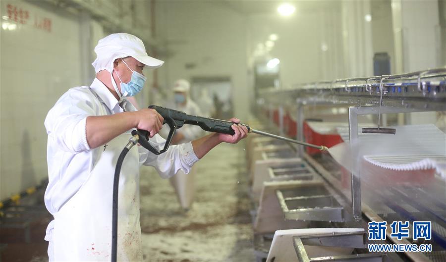 7月14日,北京二商肉類食品集團有限公司員工對肉類分割流水線進行清洗消毒。北京二商肉類食品集團有限公司是保障北京肉類市場供應的主要企業(yè)之一。新冠肺炎疫情以來,企業(yè)嚴格實施北京市、農業(yè)農村部和中國肉類協(xié)會的防疫要求,對進入廠區(qū)的人員、車輛以及原料采購、屠宰分割、產品加工、貯藏運輸、廢棄物收集及污水處理等生產環(huán)節(jié)嚴格防疫,強調源頭把關徹底消毒。目前,集團公司下屬多家生豬屠宰加工基地正常運營,保質保量供應北京市場需求。新華社記者 李欣 攝