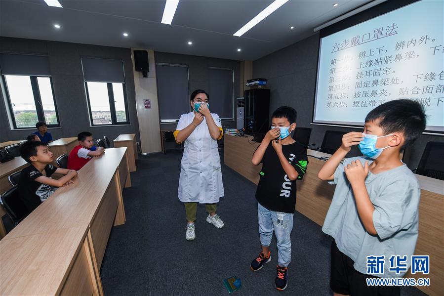 7月16日,小學(xué)生在東林鎮(zhèn)衛(wèi)生院醫(yī)護(hù)人員的示范和講解下學(xué)習(xí)正確佩戴口罩。當(dāng)日,浙江省湖州市吳興區(qū)東林鎮(zhèn)舉辦暑期“安全防護(hù)小超人”主題活動(dòng)?;顒?dòng)由醫(yī)護(hù)人員、消防隊(duì)員等為學(xué)生及家長(zhǎng)講授日常安全避險(xiǎn)及溺水急救知識(shí),中小學(xué)們還在現(xiàn)場(chǎng)學(xué)習(xí)了簡(jiǎn)易包扎、心肺復(fù)蘇的正確方式,并了解滅火器、滅火毯等消防器材的使用,為學(xué)生平安過(guò)暑期打好安全防護(hù)“預(yù)防針”。新華社記者 徐昱 攝