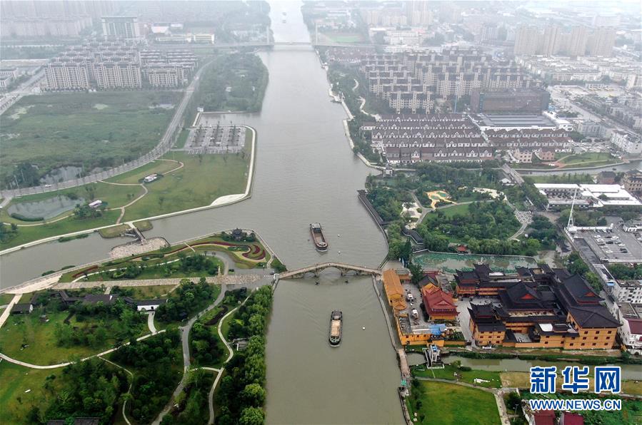 7月17日拍攝的秀洲區(qū)王江涇鎮(zhèn)長虹橋附近的河道(無人機(jī)照片)。浙江省嘉興市秀洲區(qū)處在杭嘉湖平原,受持續(xù)強(qiáng)降雨及上游排水影響,近期,秀洲區(qū)境內(nèi)的京杭大運河分支航道持續(xù)保持較高水位。當(dāng)?shù)叵嚓P(guān)部門嚴(yán)陣以待,落實各項措施,確保安全度汛。新華社記者韓傳號攝