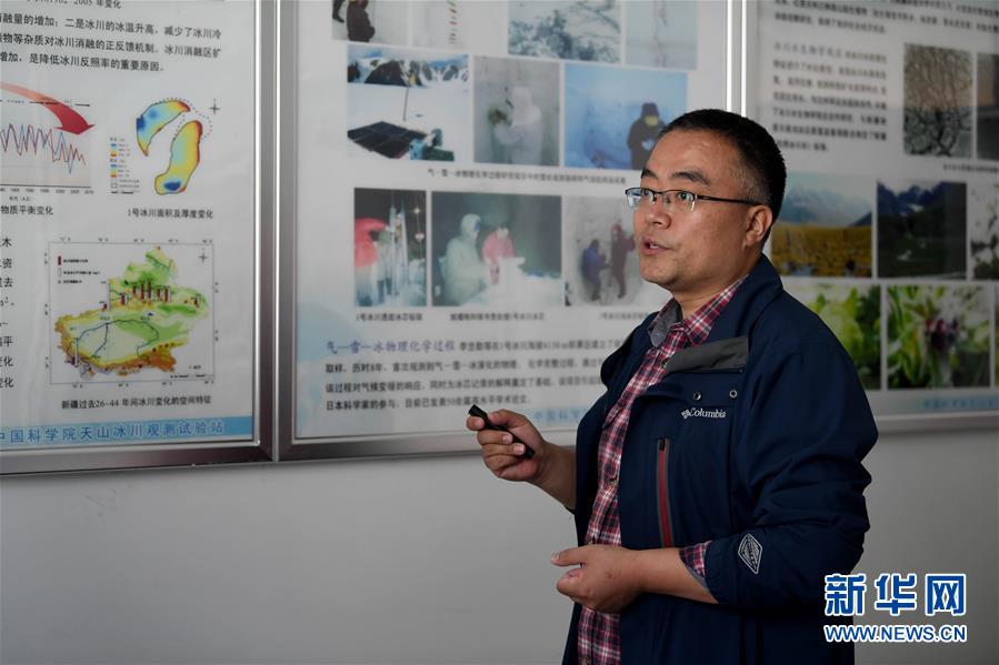 7月16日,中國科學(xué)院西北生態(tài)環(huán)境資源研究院天山冰川觀測試驗站工程師周平介紹天山一號冰川情況。新華社記者沙達提攝