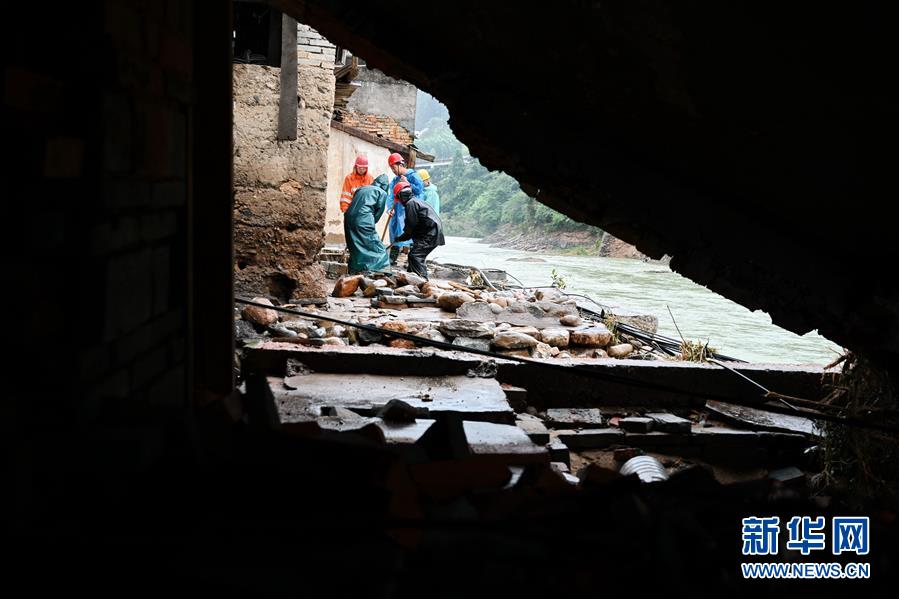 7月10日,救援人員在武夷山市洋莊鄉(xiāng)大安村幫助一戶受災(zāi)村民清理雜物。7月8日以來(lái),福建南平市多個(gè)縣市普降暴雨或大暴雨,造成部分縣市房屋倒塌、農(nóng)田被淹、道路沖毀。新華社記者林善傳攝