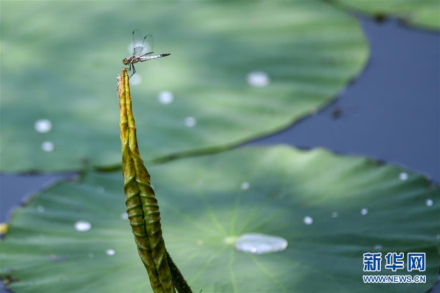 在吉林長(zhǎng)春南湖公園,一只蜻蜓在荷葉上停歇(7月16日攝)。新華社記者張楠攝