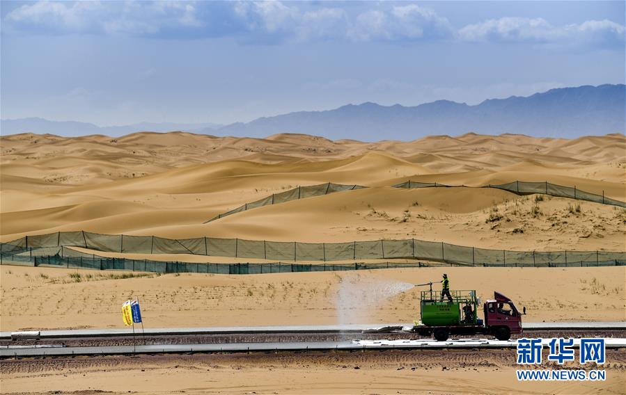 7月10日,工人在位于寧夏境內(nèi)的烏瑪高速青銅峽至中衛(wèi)段A9標(biāo)段施工。盛夏時(shí)節(jié),位于寧夏境內(nèi)的烏瑪(內(nèi)蒙古烏海市至青?,斍呖h)高速青銅峽至中衛(wèi)段正在抓緊施工建設(shè)。該路段主線全長(zhǎng)122.9公里,其中穿越騰格里沙漠腹地的18公里公路是寧夏建設(shè)的首條沙漠高速公路,預(yù)計(jì)2021年建成通車(chē)。新華社記者馮開(kāi)華攝