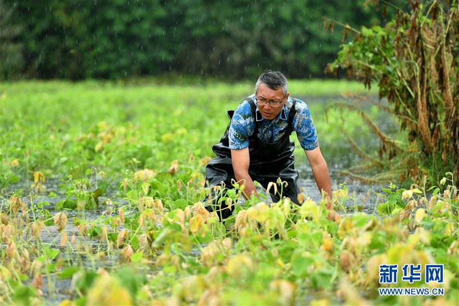 劉良武在堤壩內側積水處排查泡泉(7月19日攝)。新華社記者周密攝