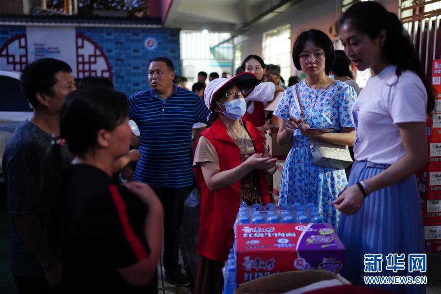 7月9日,在江西鄱陽(yáng)縣鄱陽(yáng)鎮(zhèn)集中安置點(diǎn),志愿者和工作人員為村民分配物資。新華社記者周密攝