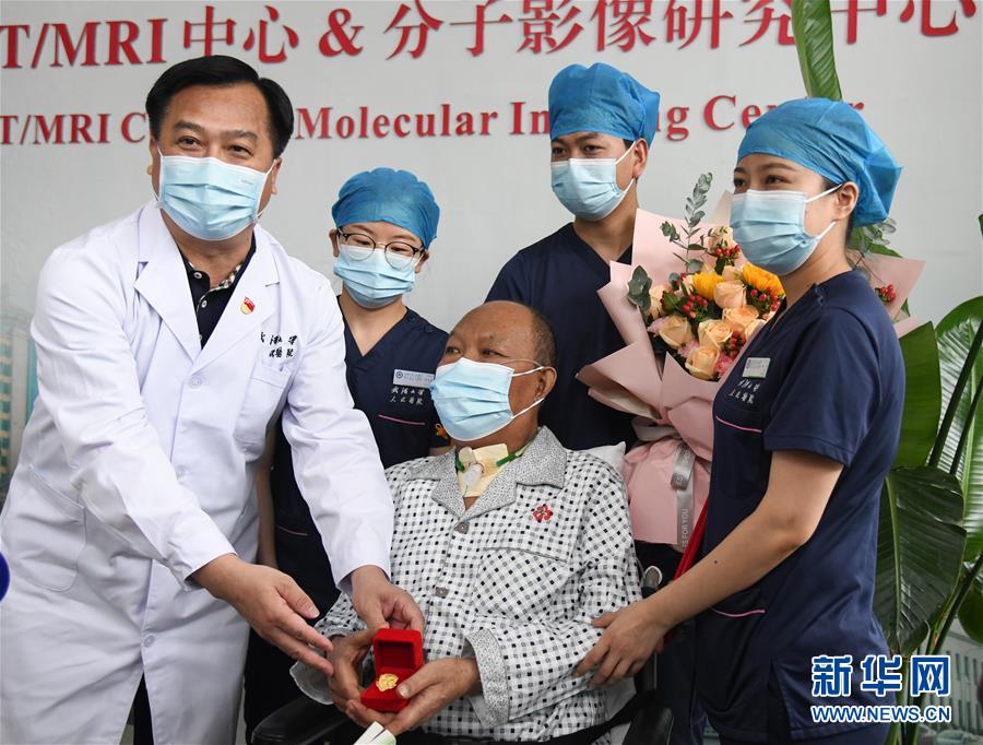 7月21日,武漢大學(xué)人民醫(yī)院黨委書(shū)記萬(wàn)紅慧(左一)為崔先生贈(zèng)送徽章。新華社記者程敏攝