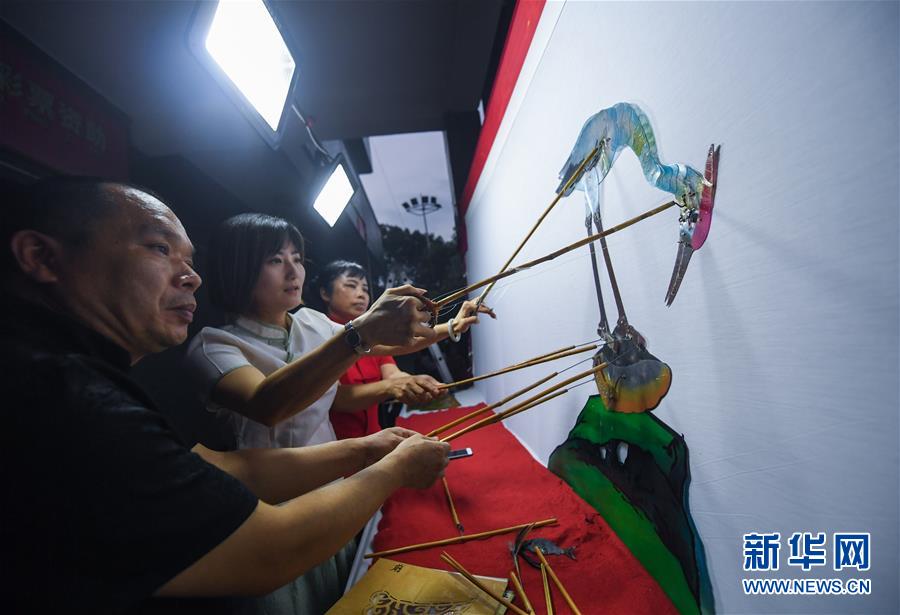7月21日,“衛(wèi)家班皮影戲”劇團的藝人們在和睦橋村的文化禮堂前為村民們上演傳統(tǒng)皮影戲《鷸蚌相爭漁人得利》。新華社記者徐昱攝