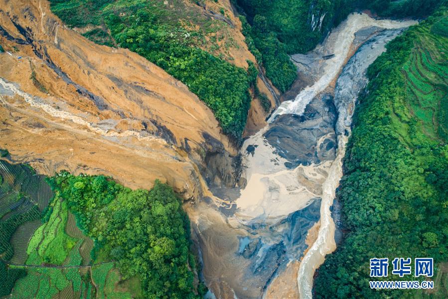7月22日拍攝的因恩施州屯堡鄉(xiāng)馬者村山體滑坡形成的堰塞湖(無人機照片)。