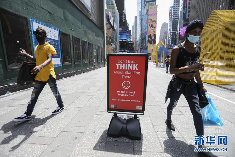 7月23日,在美國(guó)紐約時(shí)報(bào)廣場(chǎng),人們從保持社交距離的提示牌旁走過。美國(guó)約翰斯·霍普金斯大學(xué)23日發(fā)布的新冠疫情最新統(tǒng)計(jì)數(shù)據(jù)顯示,美國(guó)累計(jì)確診病例超過400萬例。數(shù)據(jù)顯示,截至美國(guó)東部時(shí)間23日15時(shí)34分(北京時(shí)間24日3時(shí)34分),美國(guó)累計(jì)確診病例4007859例,累計(jì)死亡病例143846例。新華社記者王迎攝
