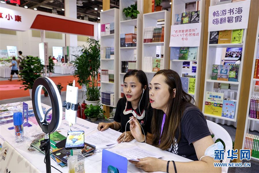 7月23日,兩位參展工作人員在網(wǎng)上直播介紹圖書。當日,第十屆江蘇書展在江蘇蘇州開幕,400多家出版發(fā)行單位參展,吸引眾多讀者選購圖書。新華社記者楊磊攝